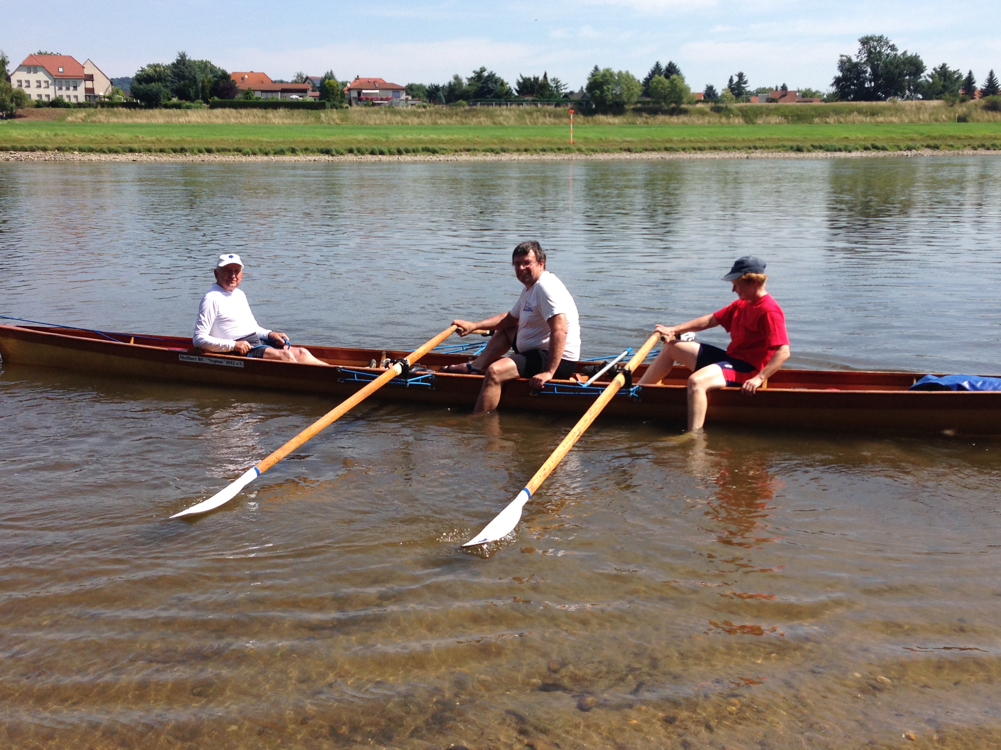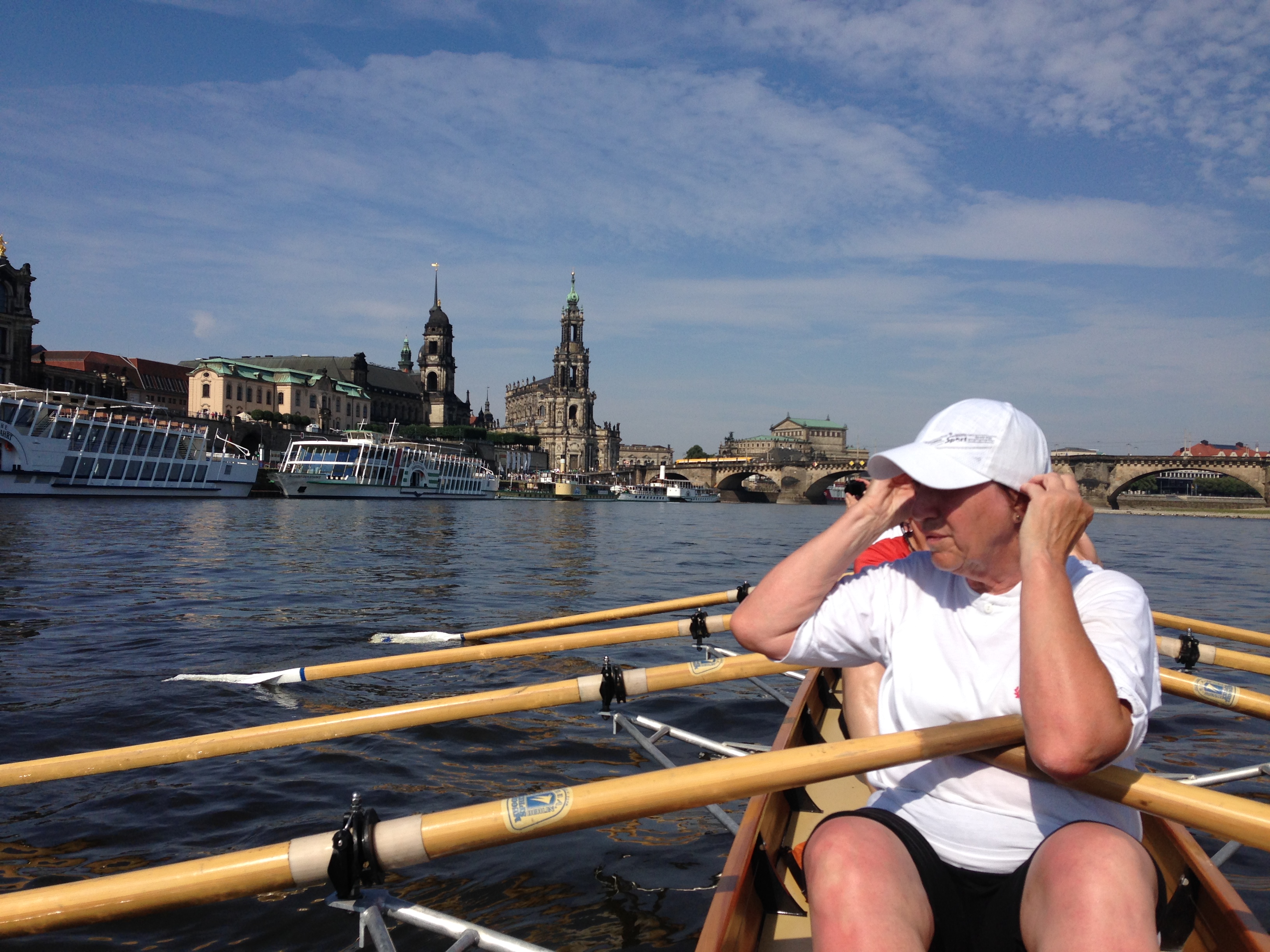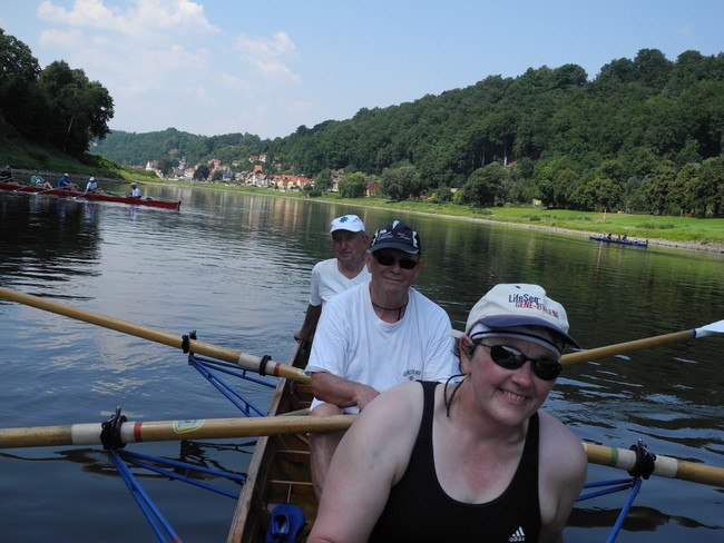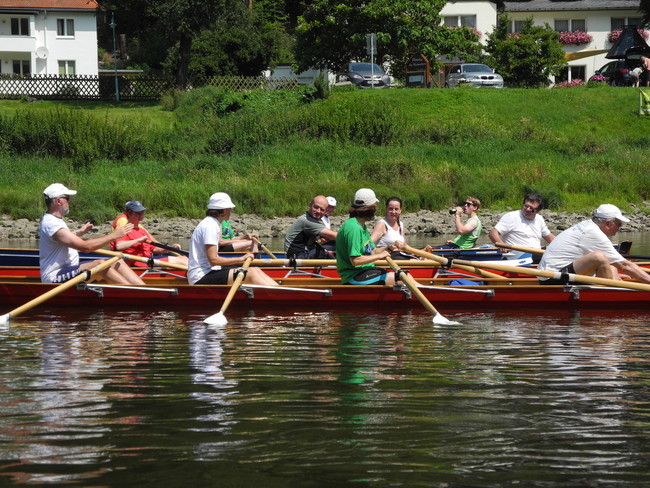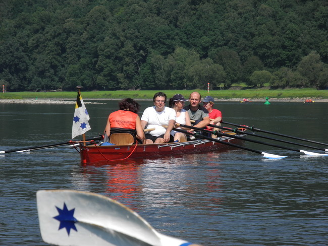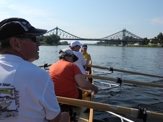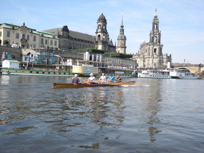 Der Wettergott meinte es viel zu gut mit uns. Den strahlenden Sonnenschein haben wir dankbar genossen, nur bei den Temperaturen hätte er gnädiger sein können. Bei mehr als 30 Grad war die körperliche Anstrengung eine Herausforderung, so dass immer wieder Treiben, Segeln und Trinkpausen sinnvoll waren. Da die Strecke von Bad Schandau nach Dresden und am nächsten Tag von Dresden nach Meißen eine ganze Menge landschaftliche Reize und historische Gebäude zu bieten hat, gab es immer einen Grund, sich an diesen Sehenswürdigkeiten einfach vorbei treiben zu lassen und zu genießen. Besonders clevere Ruderkameraden verstärkten durch besondere Hilfsmittel die Segelwirkung ihrer Boote