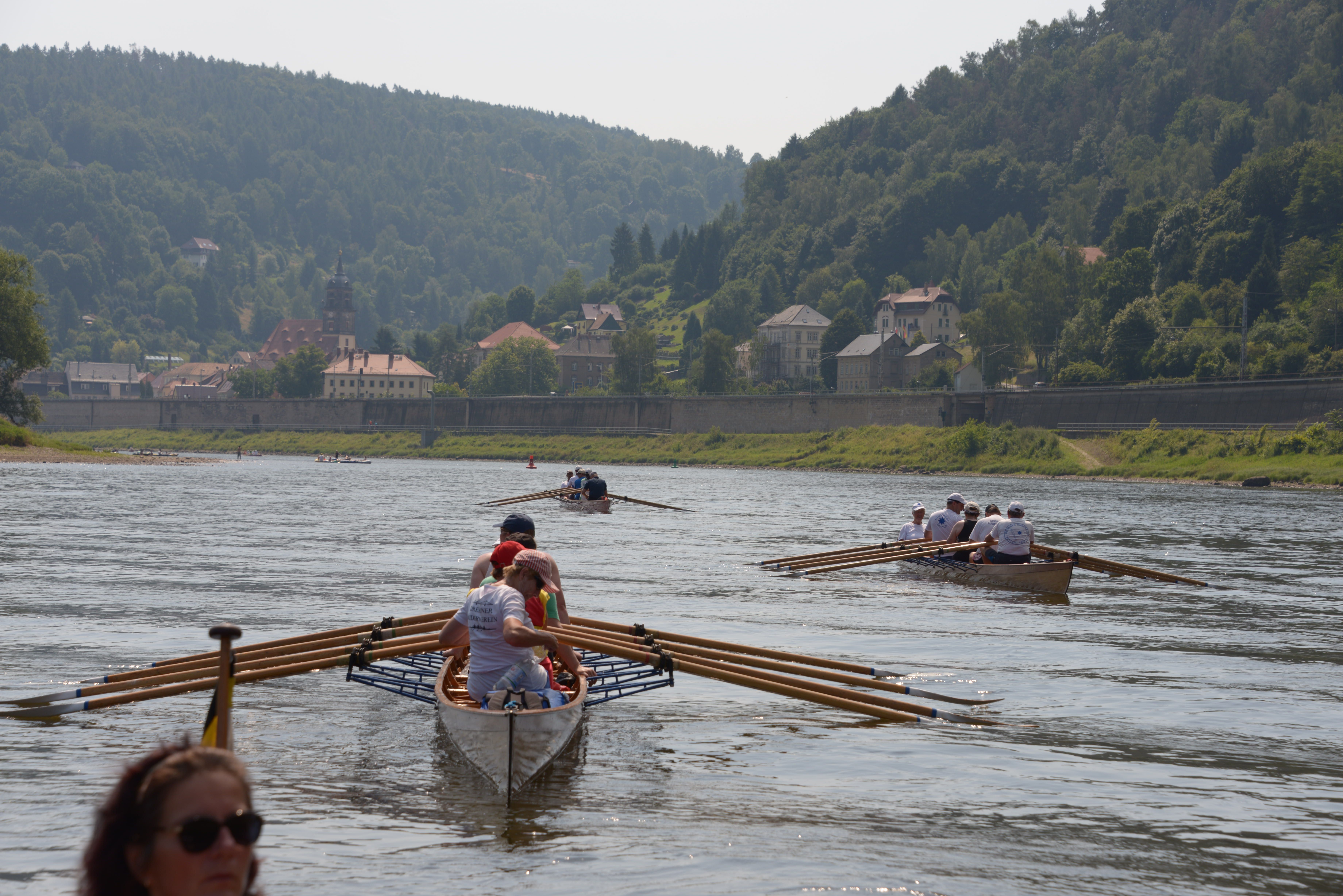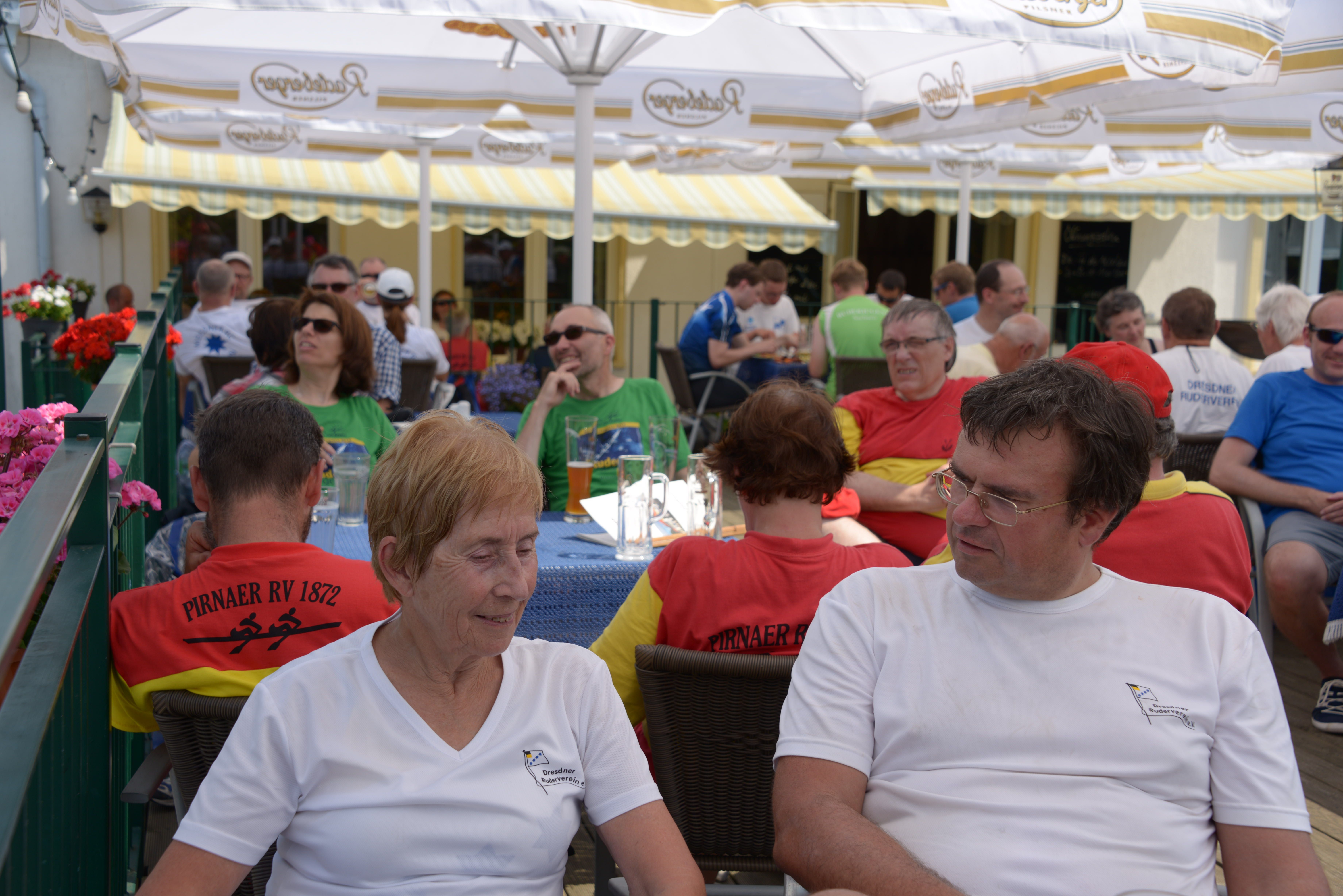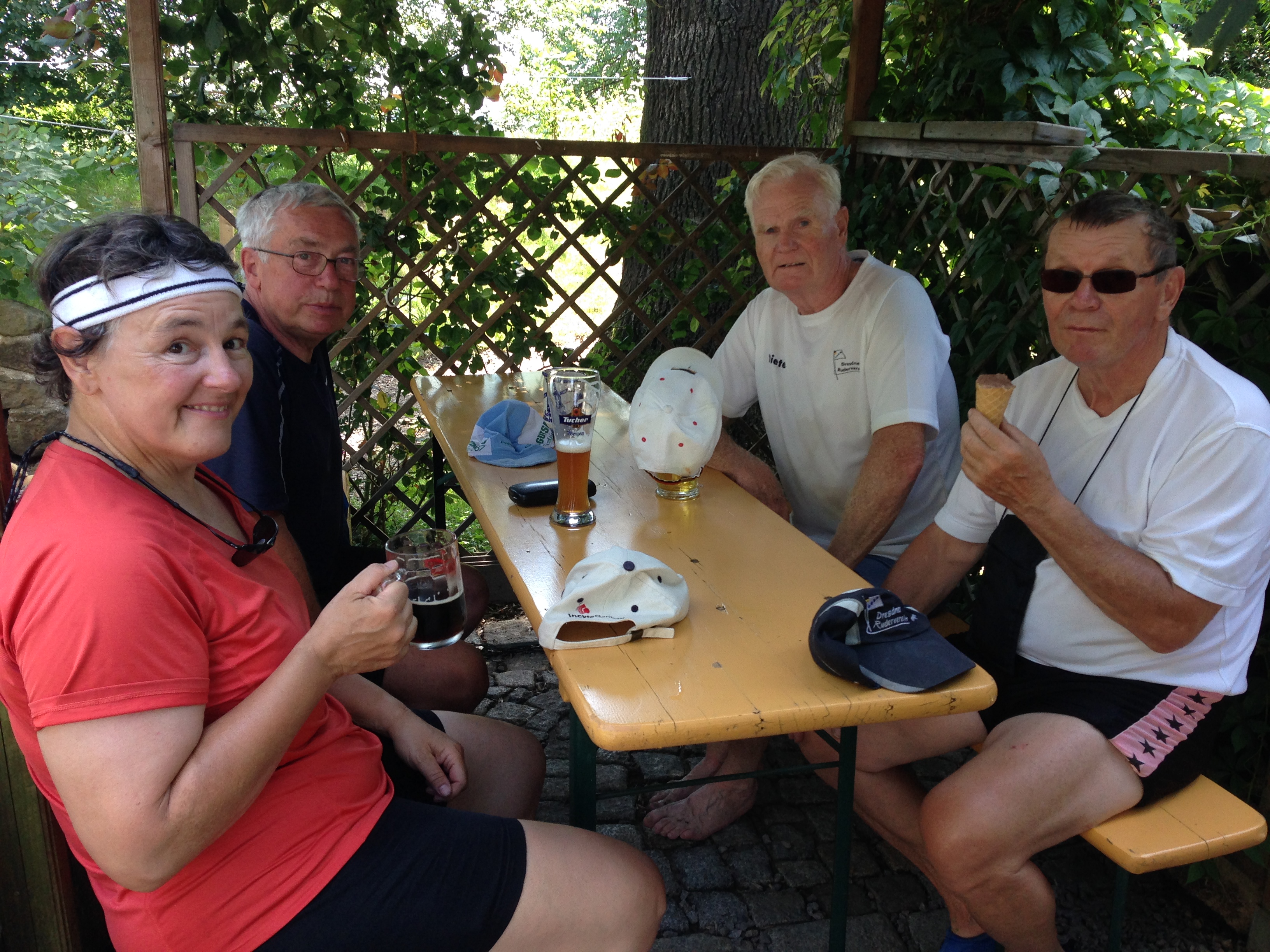 Der Wettergott meinte es viel zu gut mit uns. Den strahlenden Sonnenschein haben wir dankbar genossen, nur bei den Temperaturen hätte er gnädiger sein können. Bei mehr als 30 Grad war die körperliche Anstrengung eine Herausforderung, so dass immer wieder Treiben, Segeln und Trinkpausen sinnvoll waren. Da die Strecke von Bad Schandau nach Dresden und am nächsten Tag von Dresden nach Meißen eine ganze Menge landschaftliche Reize und historische Gebäude zu bieten hat, gab es immer einen Grund, sich an diesen Sehenswürdigkeiten einfach vorbei treiben zu lassen und zu genießen. Besonders clevere Ruderkameraden verstärkten durch besondere Hilfsmittel die Segelwirkung ihrer Boote