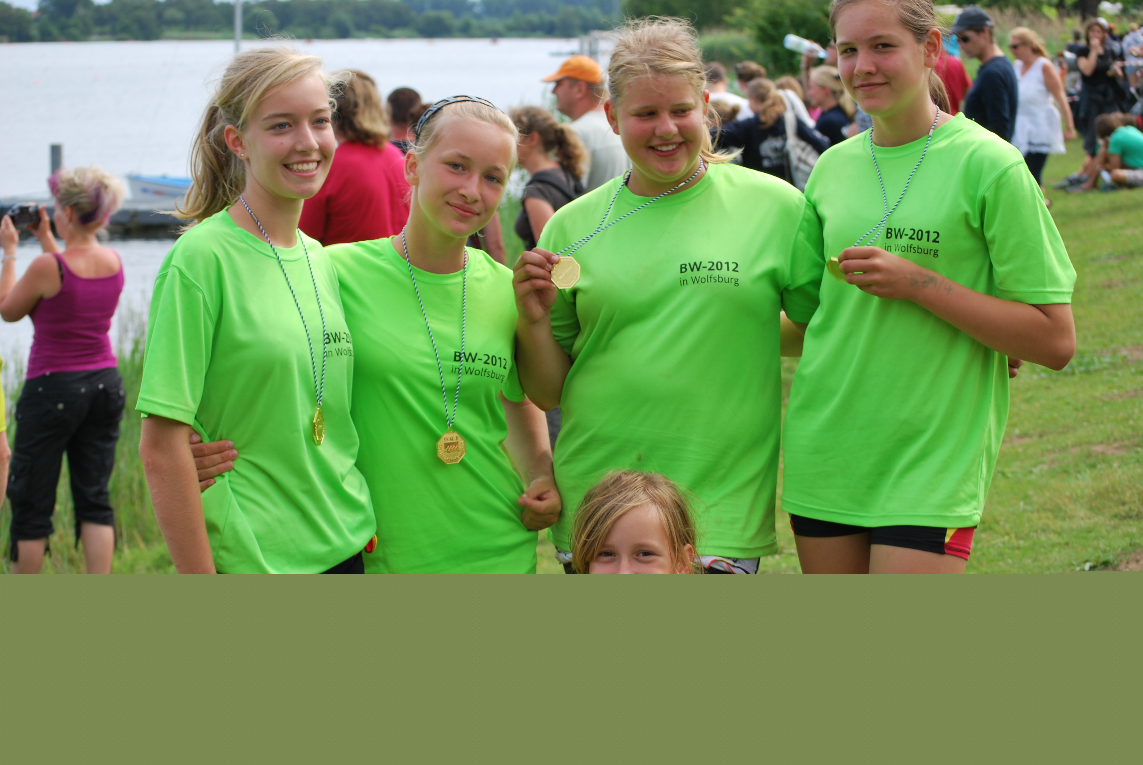 Nachdem wir die Talentiaden im Herbst und im Frühjahr, die Frühjahrslangstrecke, die Regatta in Eilenburg und die Qualifikation in Lobenstein mit guten Erfolgen hinter uns gebracht haben, ging es am 28. Juni 2012 zum Bundeswettbewerb, der dieses Jahr in Wolfsburg stattfand. Am Donnerstag bauten wir die Boote auf und machten noch eine Trainingseinheit, um das Gewässer kennen zu lernen. Nachdem unsere Gruppe das Quartier bezogen hatte, wurden die Sachsen von Steffen Buschmann begrüßt und für die nächsten Tage eingewiesen. Danach bekamen alle Kinder und Trainer der Sächsischen Ruderjugend ihre grünen T-Shirts( vom Regattsprecher als „Giftgrün“bezeichnet) und dann ging es ab in die Zimmer zur Nachtruhe.