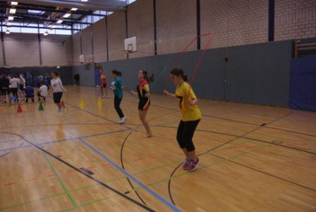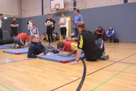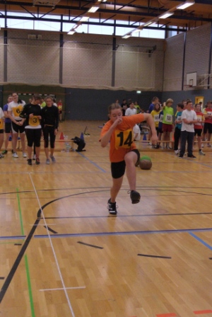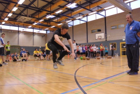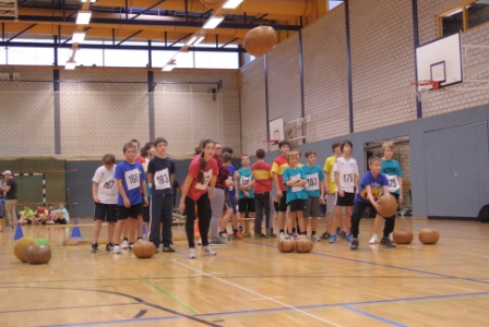 Medizinbälle flogen je nach Kraft und Technik im hohen Bogen durch die Halle oder sie kullerten auf dem Maßband entlang.