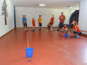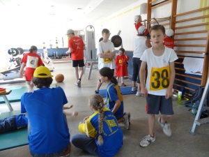 Pünktlich um 9:30 Uhr ging es mit der Begrüßung los und alle bekamen ein rotes T-Shirt mit dem Logo der Landesjugendspiele 2015 sowie ihre Startnummer ausgeteilt. Die fast 40 Teilnehmer waren voller Tatendrang und Begeisterung als es endlich losging. Ursprünglich waren neun Athletik-Übungen geplant, wovon zwei Stationen aufgrund der Witterungsbedingungen gestrichen wurden. Somit mussten die Teilnehmer „nur noch“ Hockwenden, Klimmzüge, Basketballdribbling, Zielwerfen, eine Körperspannungsübung sowie einen Athletiklauf im kühlen Bootshaus absolvieren. Im Außengelände fand schließlich noch Biathlon, selbstverständlich ohne Langlaufski, statt. Da bei diesem Wettbewerb die Ziele mehrfach verfehlt wurden, wurde es auf der Strafrunde bisweilen ganz schön voll.