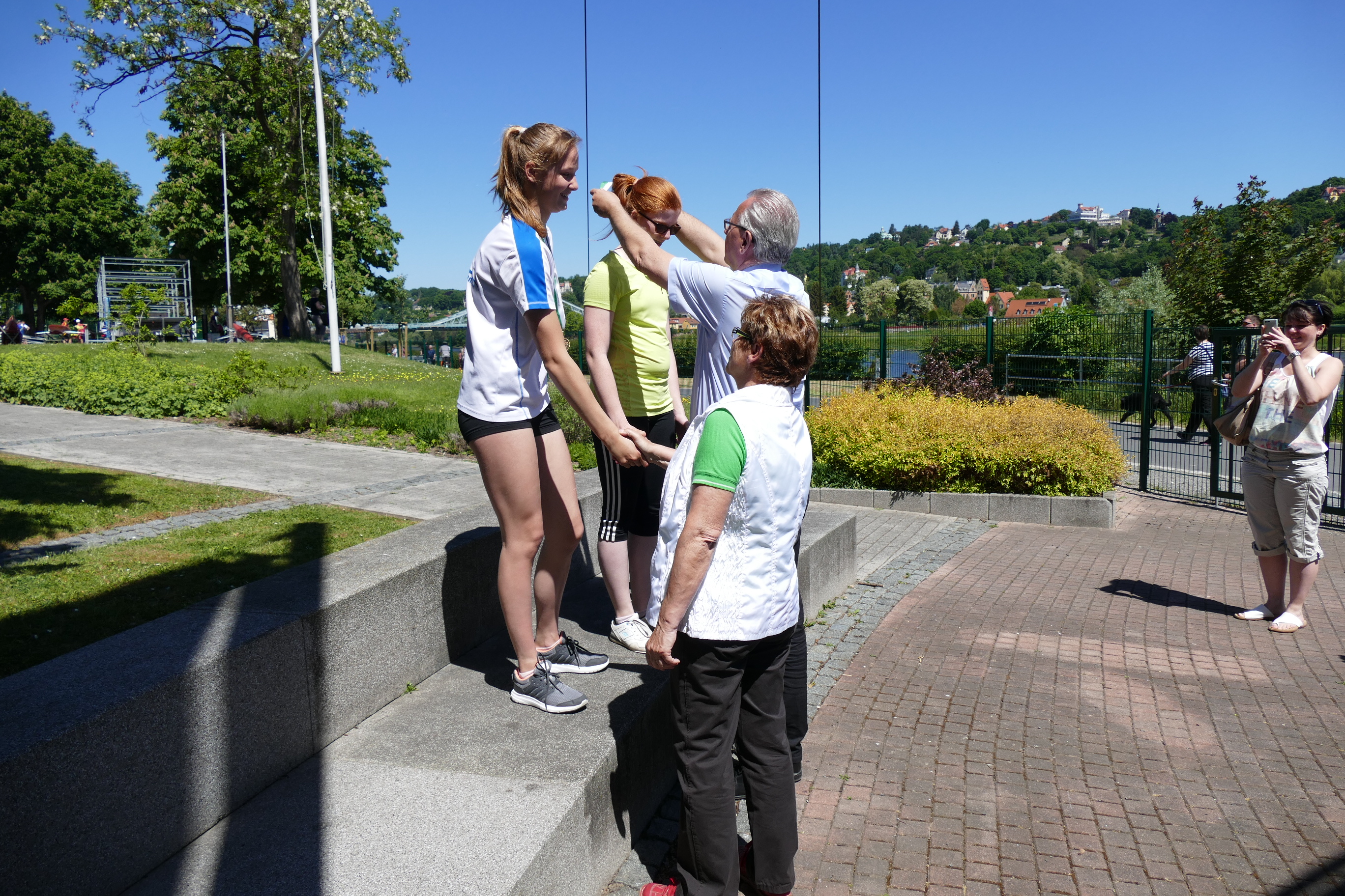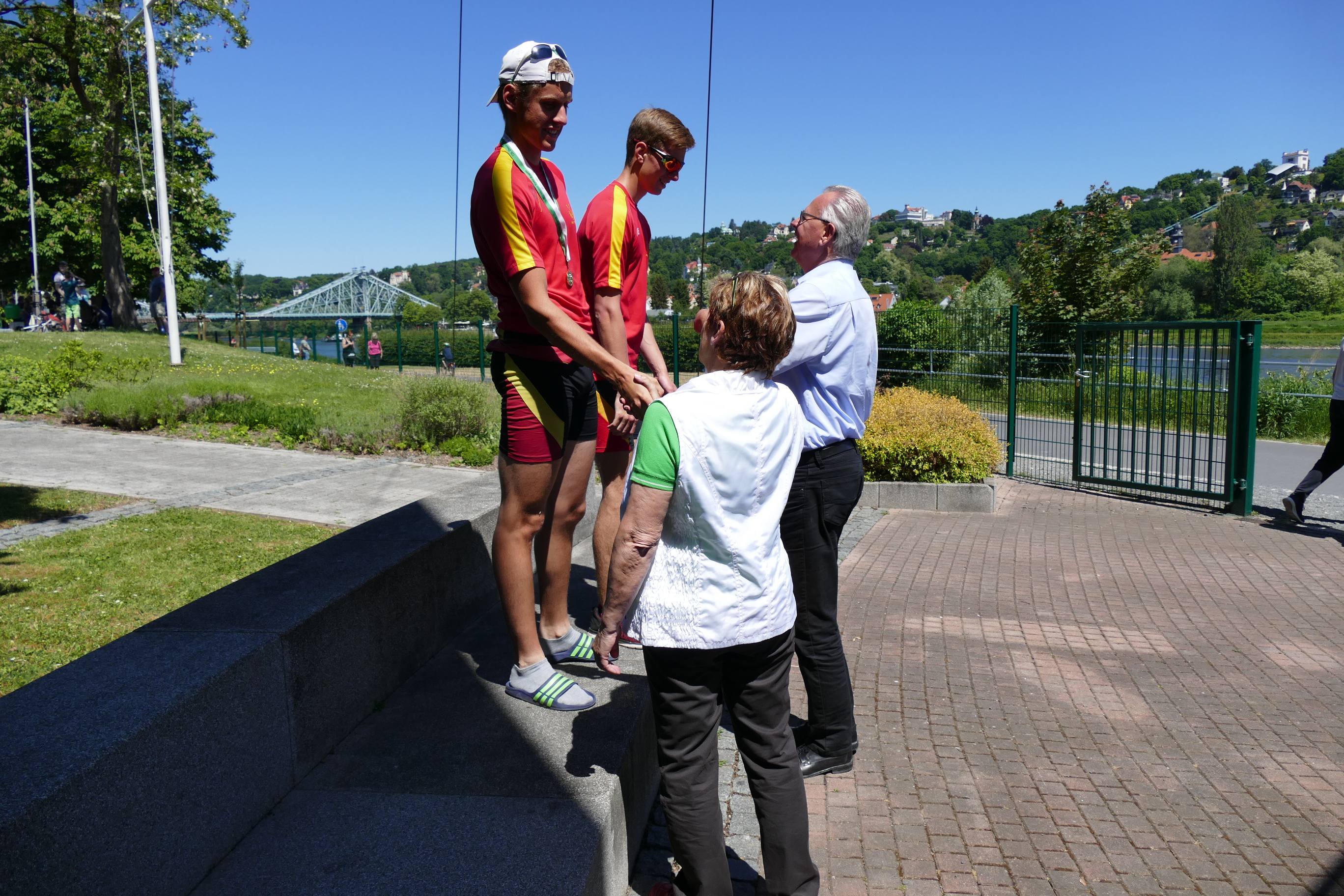 Gleichzeitig war bei diesem Wetter der Ausflugsverkehr von „Weißer Flotte“ und zahlreichen Freizeitkapitänen zu berücksichtigen. Dass die Wasserwacht und andere Hilfskräfte manchmal mehr Wellen machen als dienlich ist allgemein bekannt. Ein nicht ungefährlicher Höhepunkt war, als mitten im Renngeschehen 10 Drachenboote ihren Wettkampf durchführten. Es galt also höchsten Anforderungen gerecht zu werden. Alle Teilnehmer stellten sich erfolgreich diesen Besonderheiten des Wettkampftages. Die stolzen Sieger der Regatta haben alles richtig gemacht. Wenn es dann später einmal auf „klinisch saubere Wettkämpfe“ mit Startbrücke und Albaner System geht, werden die Erfahrungen in Dresden auf der Elbe nützlich sein.