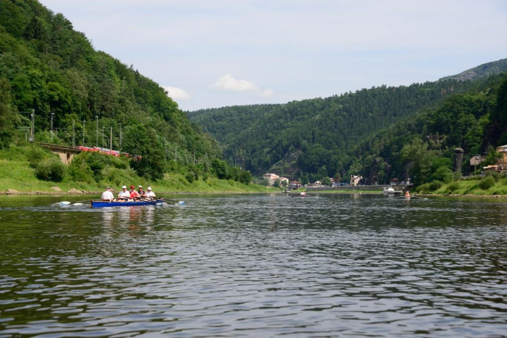 Startpunkt war diesmal Decin in Tchechien. Die Boote wurden mit dem Bootshänger zum Einsatzort gebracht. Alle Ruderer, die nicht in die Bootstransporte passten, fuhren mit dem Zug von Pirna oder Meißen nach Decin. Und das waren eine ganze Menge. So viele Menschen im Zug nach Decin kamen dem tchechischen Schaffner komisch vor und er fragte uns erstmal, ob er etwas verpasst hätte und was denn heute in Decin los wäre. Nach der Erklärung, dass wir einfach nur von Decin nach Meißen rudern wollen, war er beruhigt.