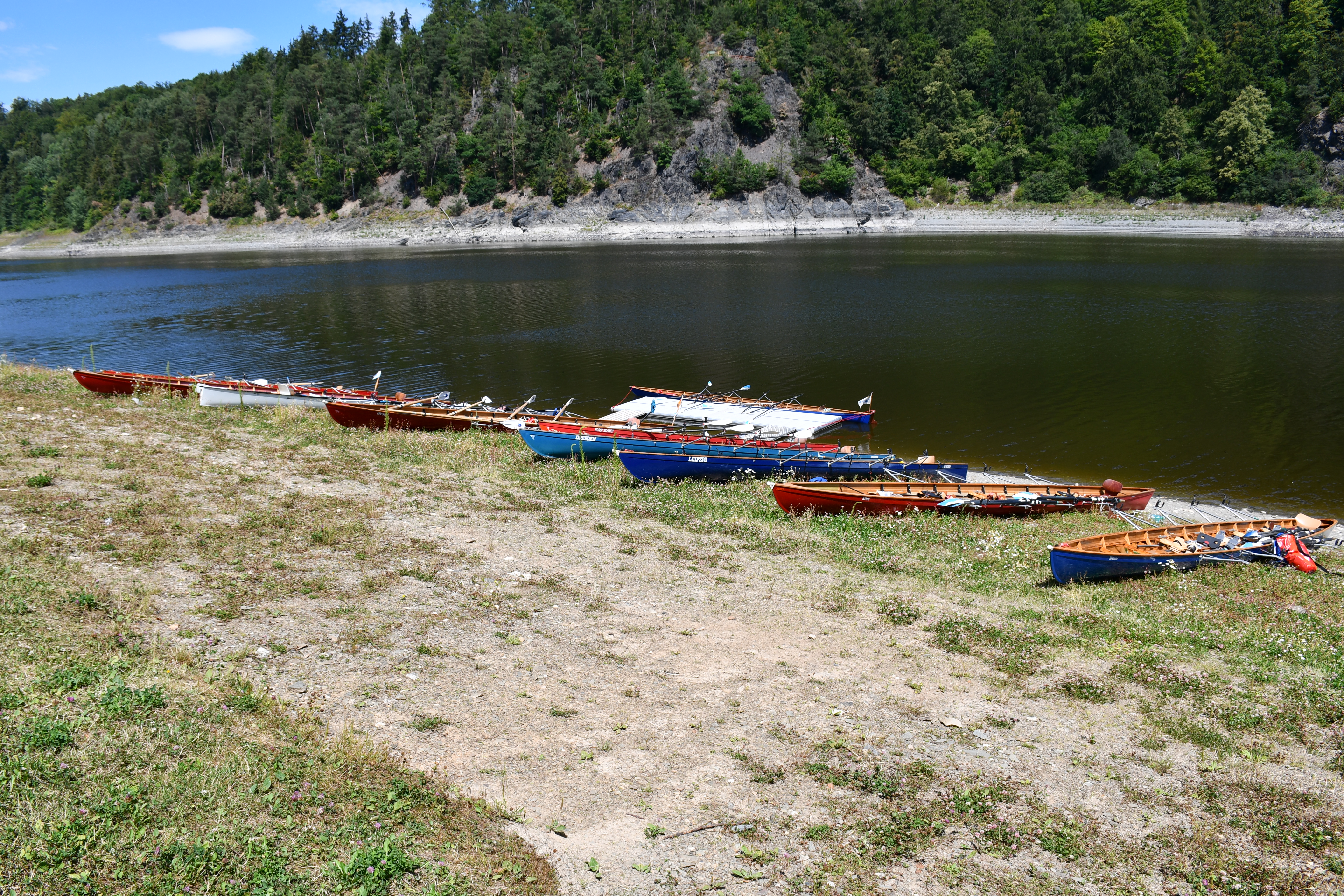 Die Samstagtour führte uns auf dem Talsperrengebiet, welches seinen Namen dem früheren Bleiabbau verdankte. Die Tour ging Saaleaufwärts, vorbei an Saaldorf in Richtung Lemnitzhammer. Auf Grund des Niedrigwassers mussten wir an einer Engstelle kurz vor dem Ziel bereits drehen. Da hatten wir den Heinrichstein und die Lobensteiner Regattastrecke bereits hinter uns. Auf der Rücktour folgte dann die Rast bei den freundlichen Ruderkameraden des Bad Lobensteiner RV. Sie bereiteten uns eine ordentliche Mittagsrast. Im Schatten erfuhren wir eine Menge Wissenswertes über den Verein und die Probleme mit dem derzeitigen Absenken des Wasserstandes um mehrere Meter. Für uns entstand dadurch ein mitunter lustiges Bild, da die Bootsstege teils weit auf dem Trockenen lagen. Während es unsere Tour wenig beeinflusste, fanden das nicht alle Anwohner so fetzig.
