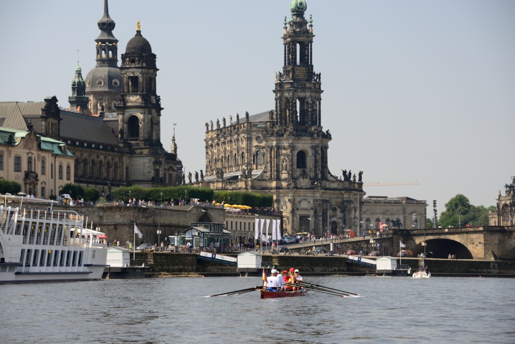 Für uns ging es entspannter zu. Die Elbschlösser Eckberg, Lingner und Albrechtsberg sowie das umgebaute Wasserwerk Saloppe (mit 33 Luxuswohnungen und Park) boten einen tollen Blick. Auf der anderen Elbseite schien sich im Johannstädter Biergarten, mit den Elbschwimmern halb Dresden zu treffen. Dieser Biergarten ist selbst an „normalen“ Sonntagen ein Magnet für viele Dresdner und ihre Gäste. Die Dresdner Elb-Bücken, Waldschlösschen (ohne Hufeisennasen), Albert-, Carola-, Augustus- und Marienbrücke (zweiteilig – wer hatte das gewusst und wie würde das gezählt?) waren schnell durchrudert. Einige nutzten dabei die Möglichkeit, wieder einmal Neues im Zentrum von Elbflorenz zu entdecken und festzuhalten. Etwas verlassen zeigte sich das Filmnächte-Areal, wo es zwei Abende zuvor mächtig „Kaiserte“. Weiter stromab durchfuhren wir die Flügelwegbrücke, kurz nach der Einfahrt zum Dresdner Hafen. Am Steg des Dresdner RC/Bundes und Landesstützpunktes konnten wir uns noch einmal die Füße vertreten. Das Haus strahlte einen ungewohnten ruhigen und friedvollen Eindruck aus. Immerhin waren noch Ferien.