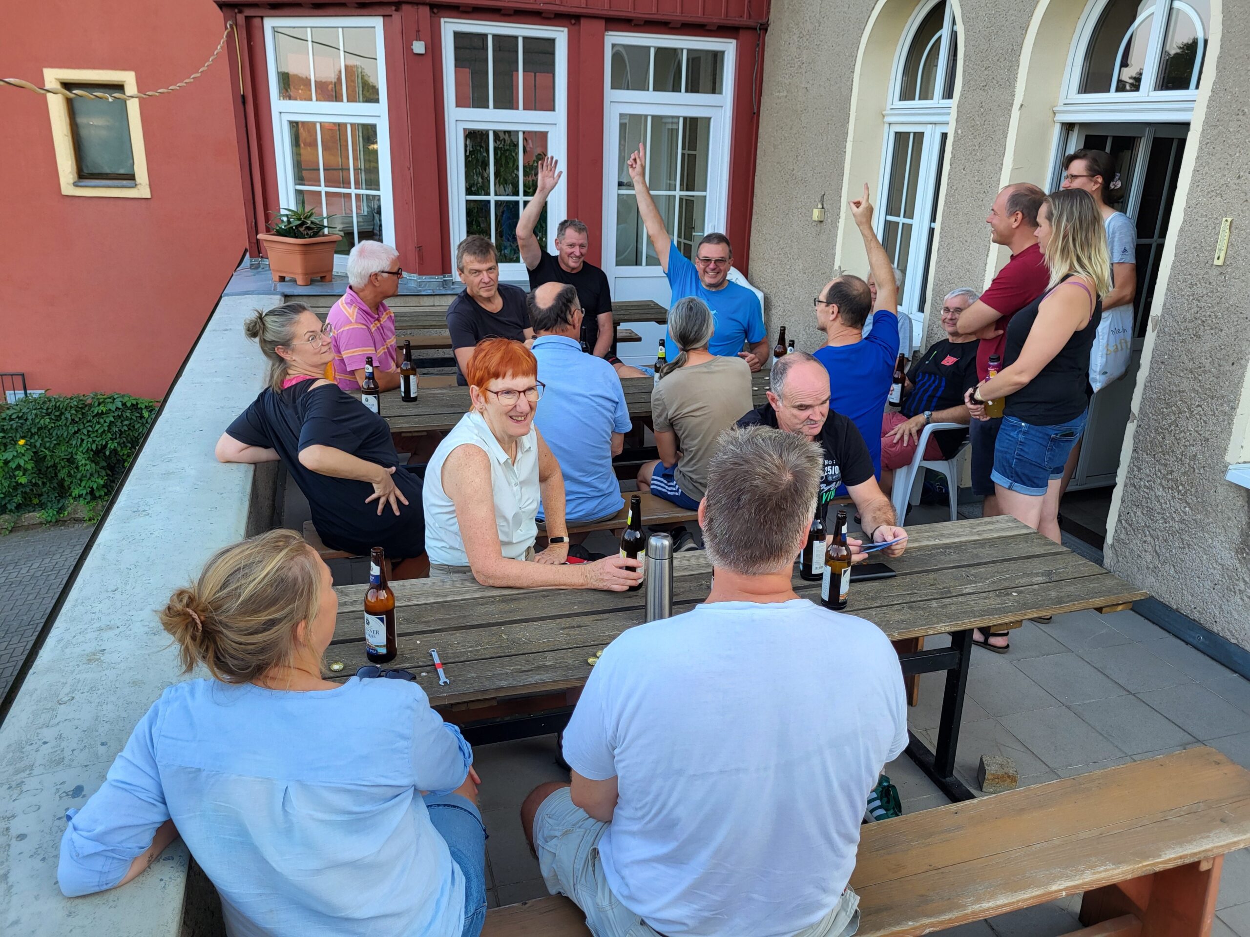 Umso erleichteter war jeder, als er die 90-Grad-Einfahrt zum Zielort Mühlberg/Elbe erreichte – wo uns die Vereinskollegen des Mühlberger Rudervereines freundlich mit Getränken und den leckeren Gerüchen von Bratwurst, Steaks und irgendeiner panierten Wurst (einheimische Delikatesse) willkommen hießen.
