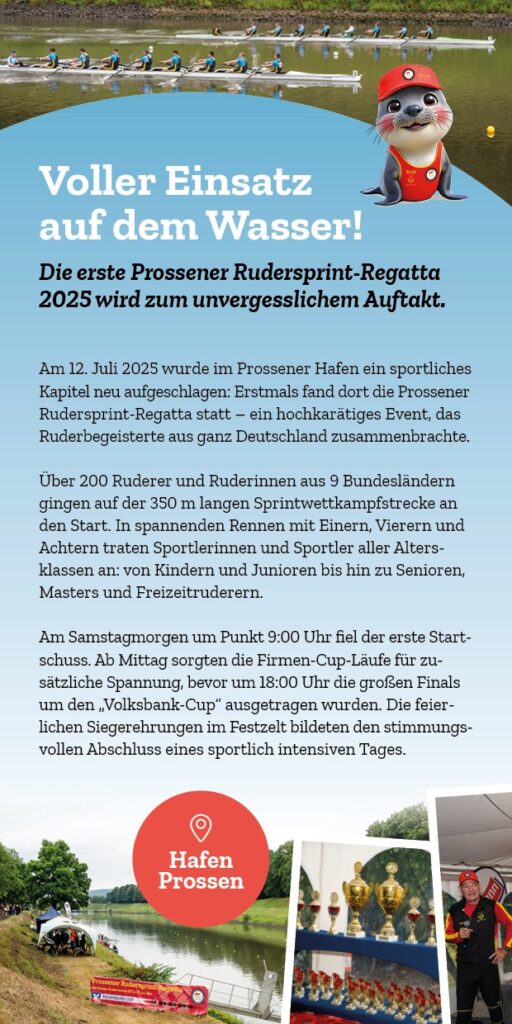 Mit der 1. Prossener Rudersprint-Regatta wurde ein neues Kapitel im regionalen Rudersport aufgeschlagen. Die Kombination aus sportlicher Herausforderung, spannenden Wettkämpfen und einem herzlichen Miteinander hat gezeigt, dass dieses Format weit mehr ist als nur ein Wettkampf – es ist ein Fest für alle, die den Rudersport lieben.