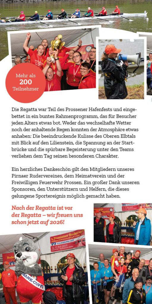 Am Samstag, dem 12. Juli 2025, war es endlich so weit: Mit der 1. Prossener Rudersprint-Regatta feierte ein neues sportliches Format im Prossener Hafen seine Premiere. Trotz regnerischen Wetters ließen sich weder die Teilnehmer noch die zahlreichen Zuschauer die Stimmung verderben. Die Kulisse – direkt an der Elbe mit Blick auf den imposanten Lilienstein – bot einen einzigartigen Rahmen für dieses neue Ruder-Highlight im Kalender des Pirnaer Rudervereins.