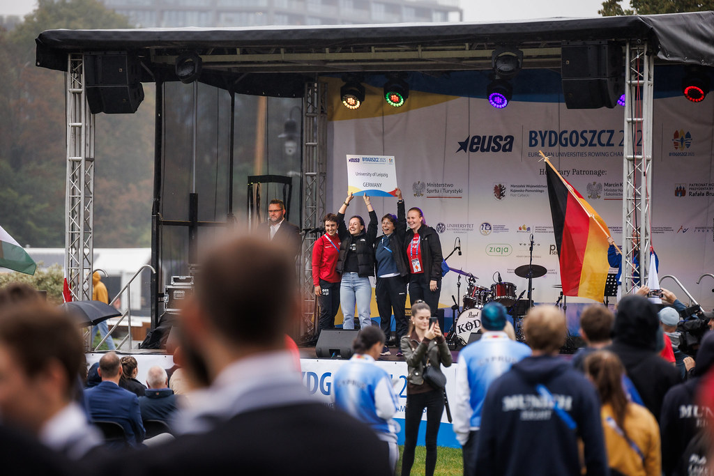 Der Frauen-Doppelvierer der Universität Leipzig erreichte das kleine Finale. Pauline Sauter (Heidelberger RK), Tilla Dora Panzner (HRC Halle), Finja Carstens und Lisa Feldhusen (beide ARV Leipzig) belegten am Ende Rang acht. Im B-Finale kam das Boot auf Platz zwei hinter Kopenhagen und vor Schweden. Nach Rang fünf bei der EUC 2024 in Zagreb und dem deutschen Meistertitel 2024 folgte damit diesmal eine Platzierung im Mittelfeld.